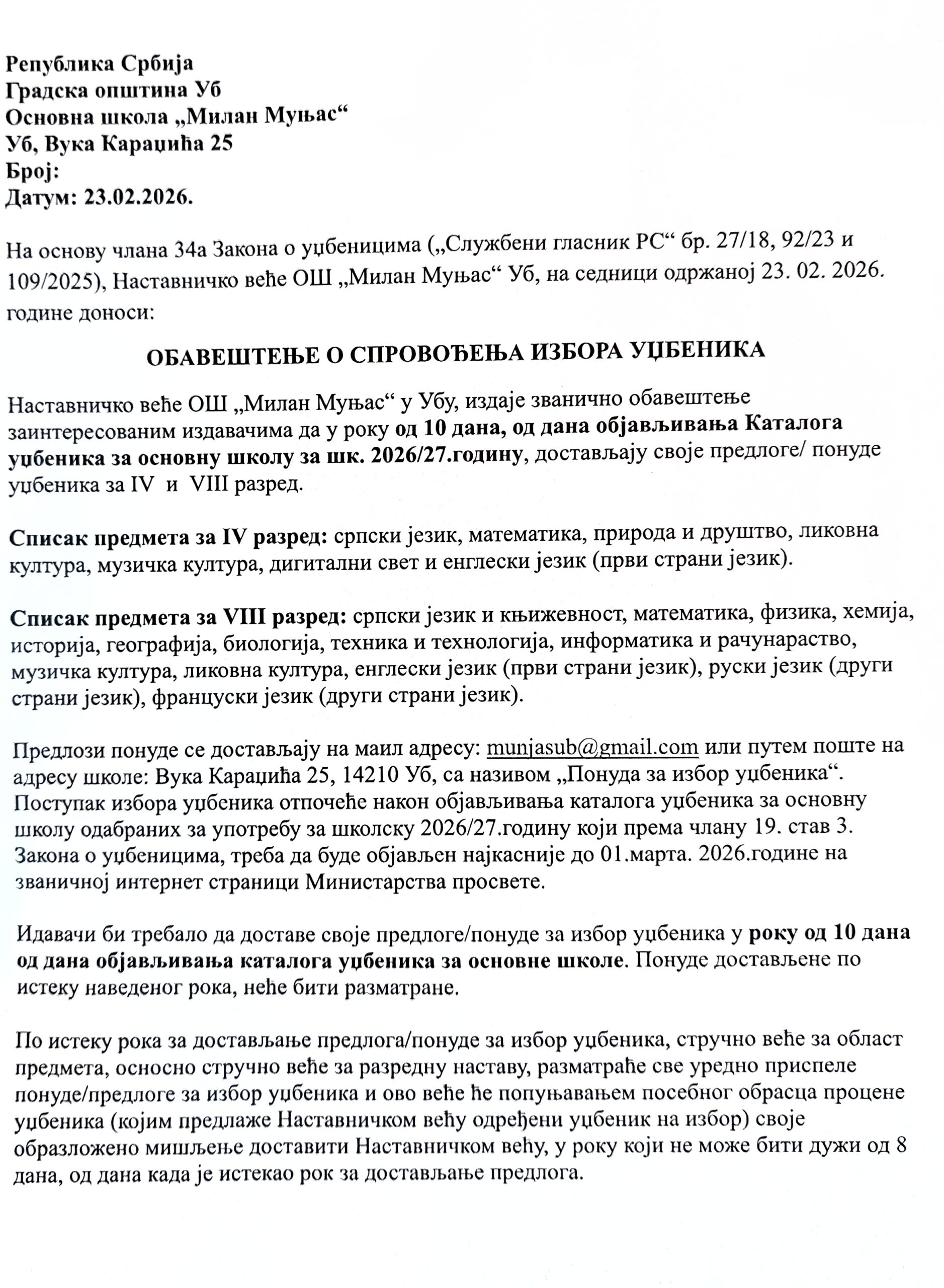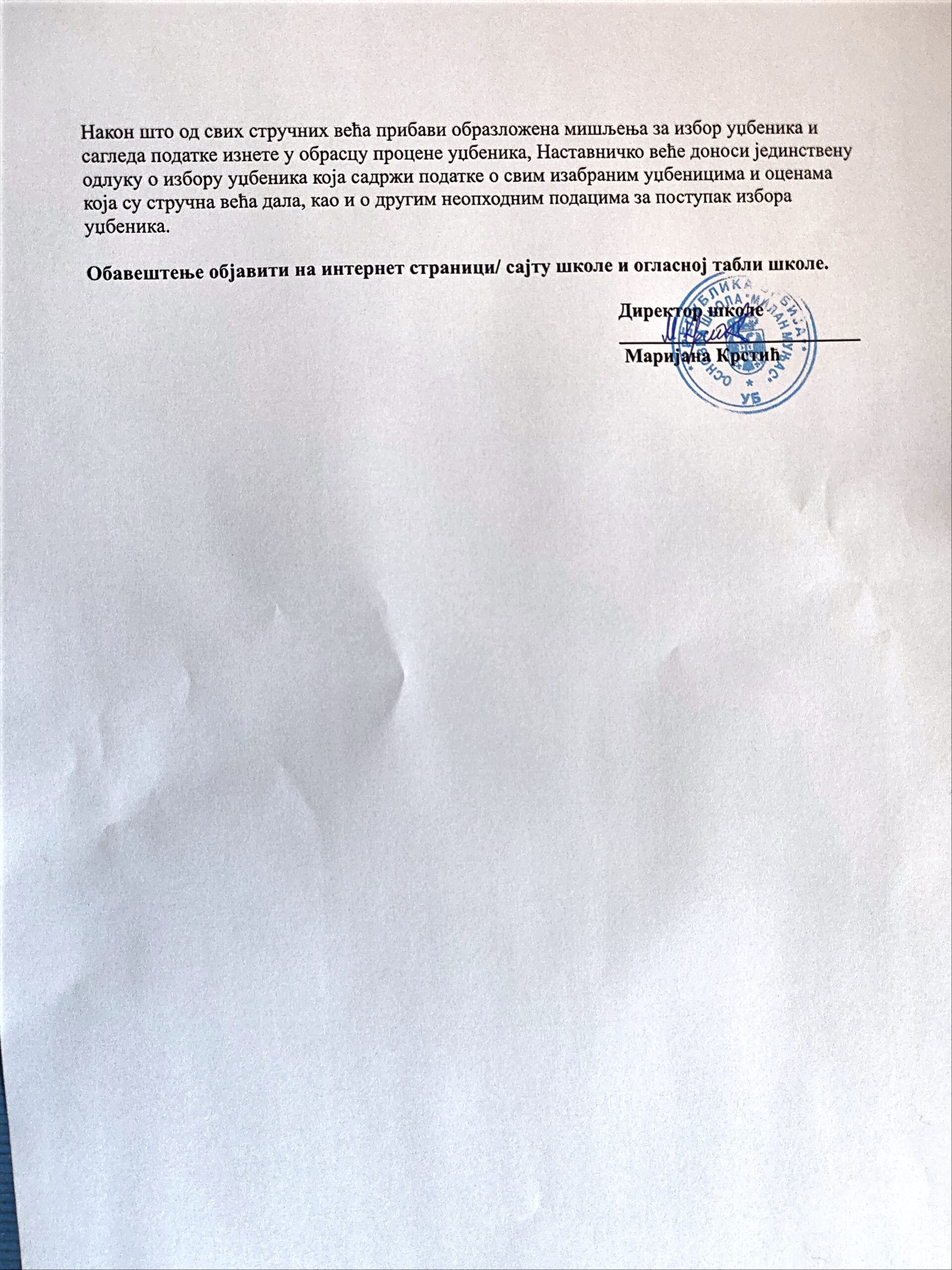 Обавештење о спровођењу избора уџбеника